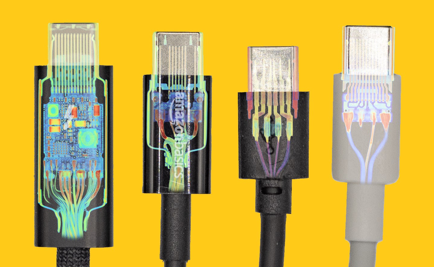 Öte yandan Lumafield’ın X-Ray taramaları “ucuz etin yahnisi yavan olur” deyiminin somut bir şekilde kanıtlıyor diyebiliriz. Mesela aşağıda, NiceTQ tarafından sunulan 5,59 dolarlık bir USB-C kablosuna bir bakalım. Buradaki hiçbir şey korumalı değil; pinler ve konnektör kabuğunun tamamı aşırı kalıplanmış plastik içinde bağımsız olarak duruyor (lehimleme işleminden arta kalan metal kalıntıları ile birlikte). Bu konnektörde 8 pin var, ancak sadece 4’ü herhangi bir şeye bağlı ve doğrudan kablonun tellerine lehimlenmiş. İlginç bir şekilde bu kablo, 10 Gbps (USB 3.1 Gen 2) hızında veri aktarımı yaptığı iddia ediliyor. Ancak bariz bir şekilde kablonun pinleri ve kabloları yalnızca 480 Mbps’ye kadar çıkabilen USB 2.0 için yapılandırılmış.