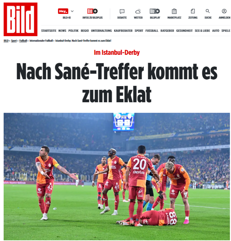 BILD / ALMANYA: Galatasaray ile Fenerbahçe arasındaki İstanbul derbisi 1-1 berabere bitti. Alman yıldız futbolcular Leroy Sané ve İlkay Gündoğan olayların tam ortasındaydı. Sané takımının açılış golünü bile attı – ama golden hemen sonra büyük bir skandal patlak verdi! Maç yaklaşık beş dakika durdu, ardından devam edebildi.
